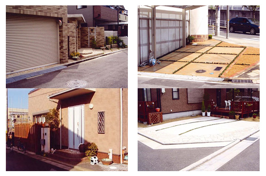 玄関アプローチのデザイン性には様々。玄関アプローチとカースペースを色分けしたり、広い玄関アプローチには、デザインタイルでメイクアップ。 また和風住宅、民家にも工夫次第で自然に溶け込みます。