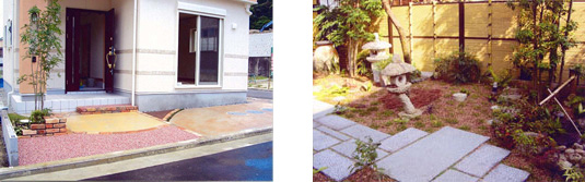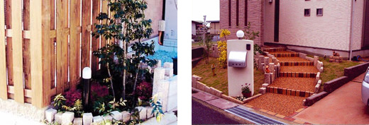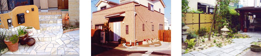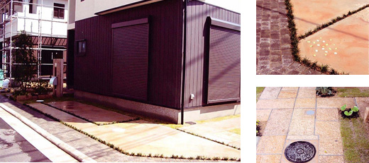住まいの外観をつかさどる外構・エクステリア工事。天然石を使用し、アプローチの部分は職人自らひとつひとつ心を込めて敷き詰めていきます。また、ガーデニングも同時に行う事により、生活に花を添えます。